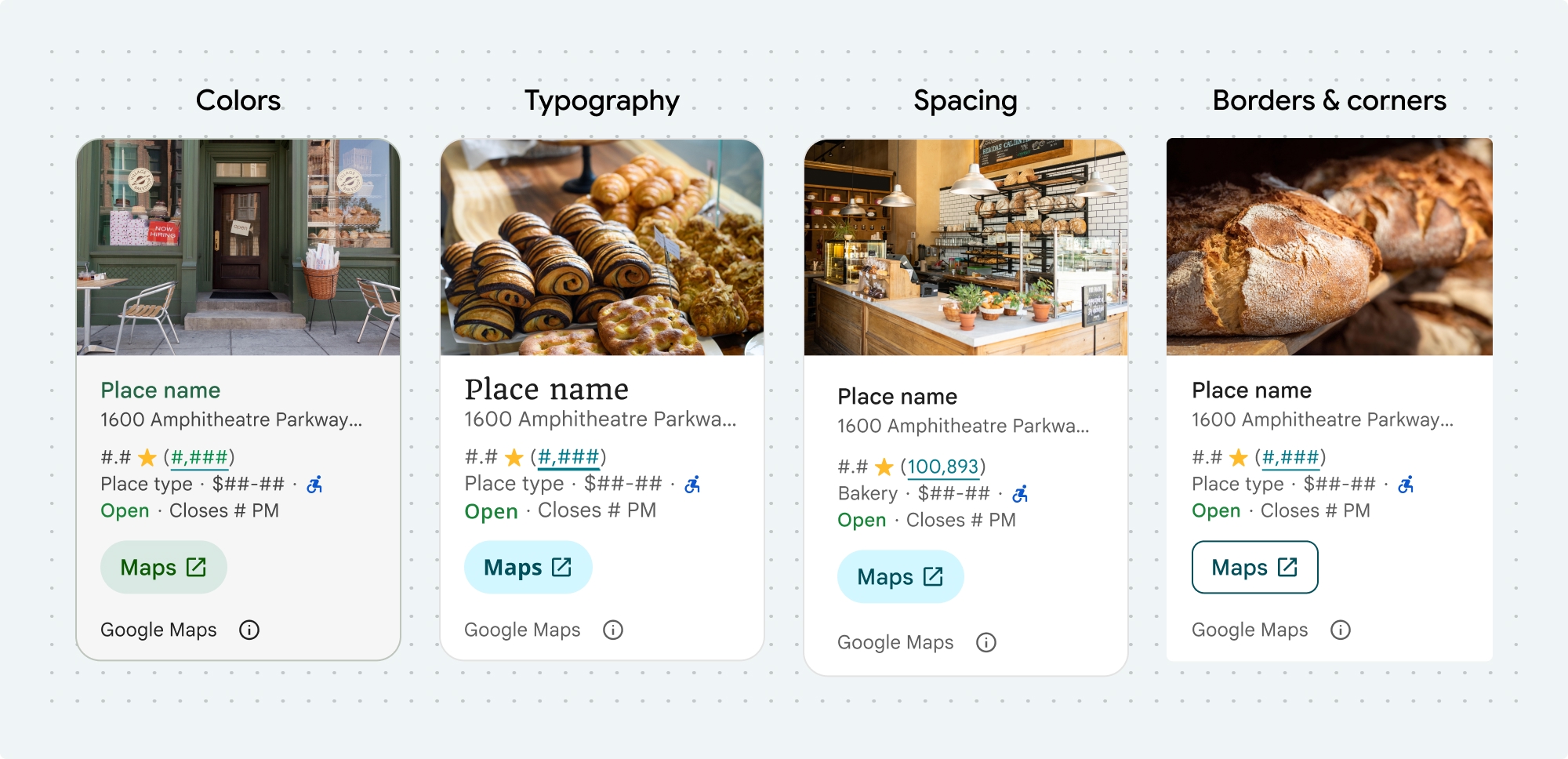 ชุดเครื่องมือ UI ของ Places มีแนวทางระบบการออกแบบสำหรับการปรับแต่งภาพโดยอิงตาม Material Design โดยประมาณ (มีการแก้ไขบางอย่างที่เฉพาะเจาะจงสำหรับ Google Maps) ดูข้อมูลอ้างอิงของ Material Design สำหรับสีและการพิมพ์ โดยค่าเริ่มต้น สไตล์จะเป็นไปตามภาษาการออกแบบภาพของ Google Maps