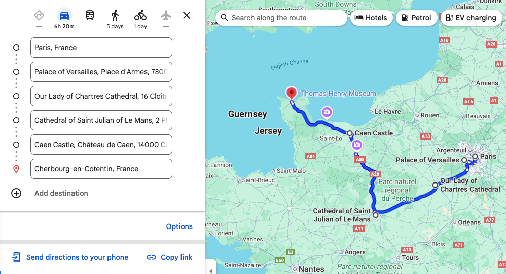 ตัวอย่างเส้นทางต่อไปนี้จะเปิด Google Maps และแสดงเส้นทางขับรถจากปารีส ฝรั่งเศส ไปยังเชอร์บูร์ก ฝรั่งเศส โดยกำหนดเส้นทางผ่านจุดแวะพักต่อไปนี้