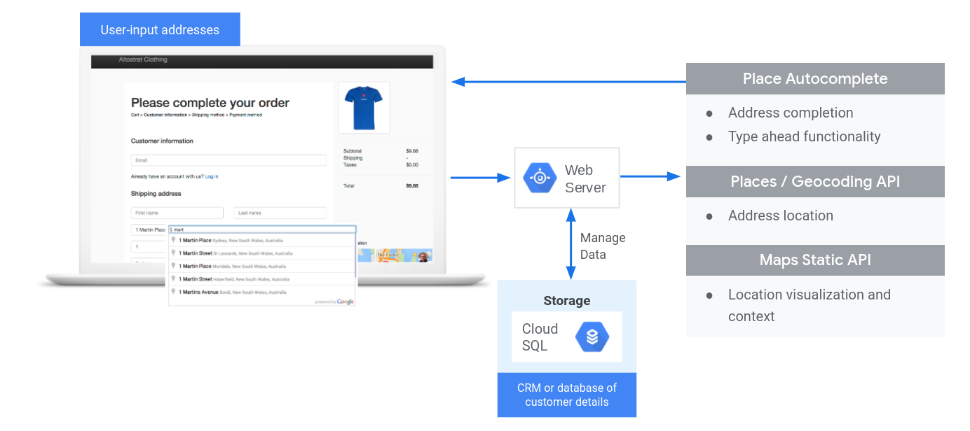 Place Autocomplete simplifie la saisie des adresses dans votre application, ce qui permet d'augmenter les taux de conversion et d'offrir une expérience fluide à vos clients. Autocomplete propose un champ de saisie unique et rapide avec une prédiction de l'adresse, qui permet de remplir automatiquement un formulaire d'adresse de facturation ou de livraison.