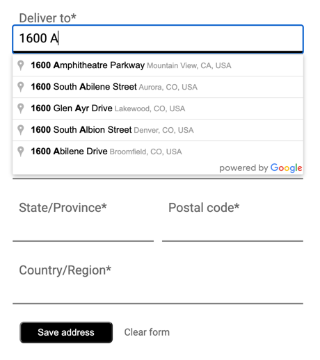 Tính năng Tự động hoàn thành địa điểm có thể đơn giản hoá việc nhập địa chỉ trong ứng dụng, giúp tăng tỷ lệ chuyển đổi và mang lại trải nghiệm liền mạch cho khách hàng. Tính năng tự động hoàn thành cung cấp một trường nhập nhanh duy nhất với tính năng dự đoán địa chỉ "nhập trước" có thể được dùng để tự động điền vào biểu mẫu địa chỉ thanh toán hoặc địa chỉ giao hàng.