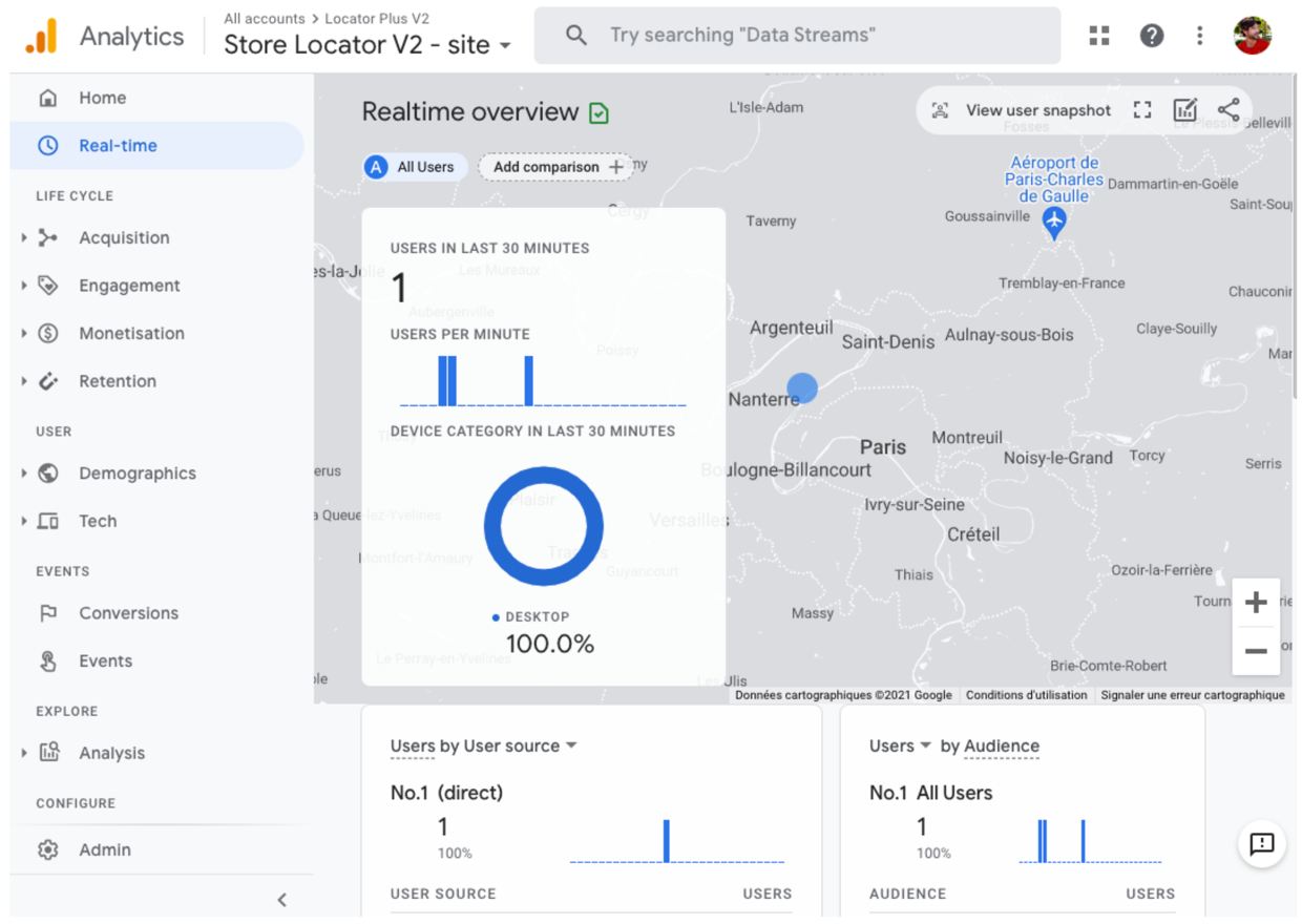 يمكنك التأكّد من تسجيل علامات الأحداث المخصّصة بشكلٍ صحيح من خلال عرض ملف الاطّلاع "الوقت الفعلي" في "إحصاءات Google". على سبيل المثال، يظهر الحدث "الموقع الجغرافي" الذي تم إعداده سابقًا لميزة إكمال الأماكن تلقائيًا في "إحصاءات Google" كما هو موضّح في الأشكال التالية.