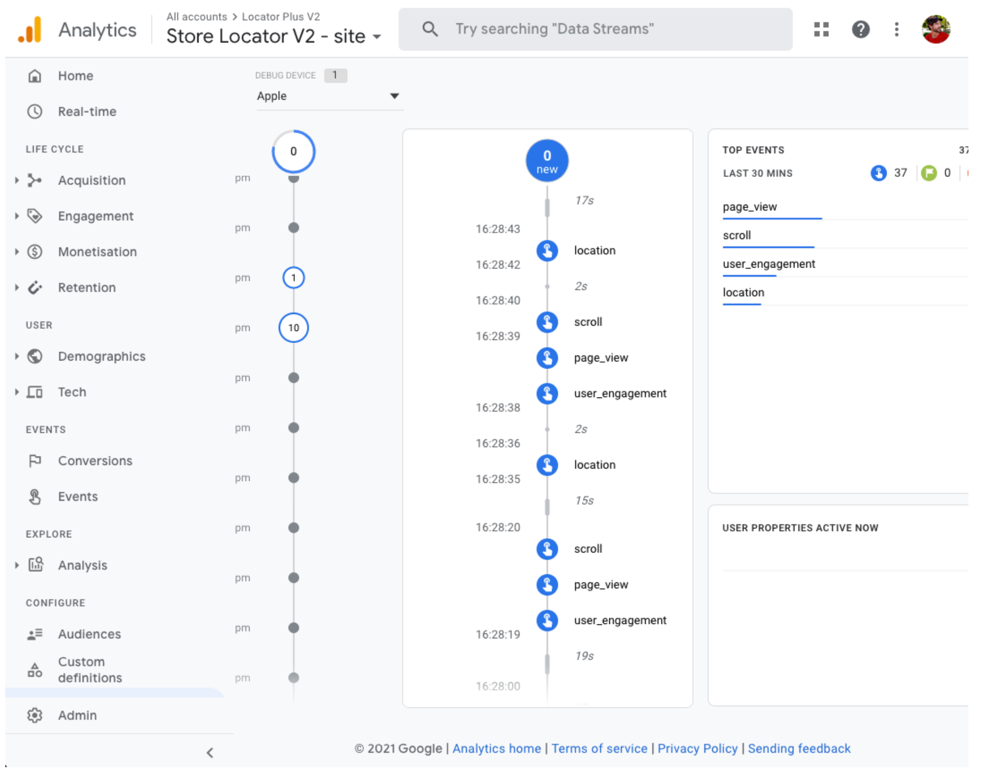 इसके अलावा, DebugView का इस्तेमाल करके रीयल-टाइम इवेंट को मॉनिटर किया जा सकता है, जैसा कि नीचे दिए गए चित्र में दिखाया गया है. ध्यान दें कि Google Analytics के यूज़र ऐक्टिविटी > इवेंट सेक्शन में, इवेंट की पूरी रिपोर्ट ऐक्सेस करने से पहले आपको 24 घंटे इंतज़ार करना होगा.