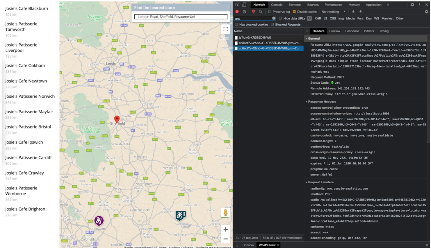 다음 그림은 브라우저의 Inspect 뷰에서 Network 탭에 표시되는 Google 애널리틱스 호출을 보여 줍니다(클릭하여 확대).