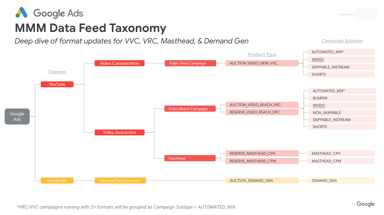Die folgende Abbildung zeigt eine allgemeine Datenfeed-Taxonomie für Google Ads. Klicken Sie auf das Bild, um es zu vergrößern.