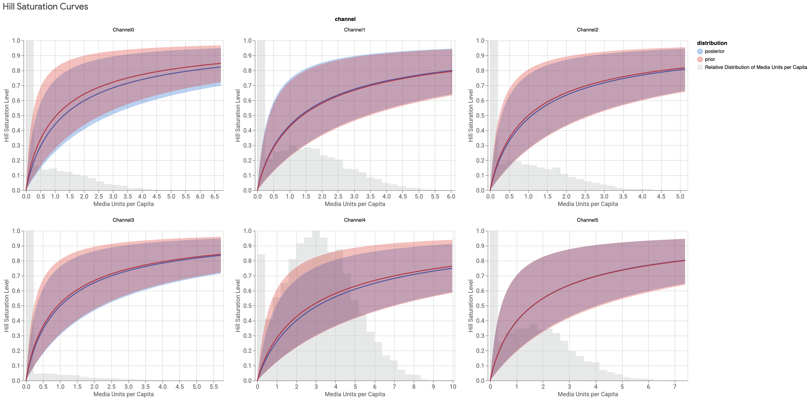 メディア効果の可視化データは、MediaSummary クラスと MediaEffects クラスで確認できます。ここでは、それぞれに違うプロットでチャネルごとのメディア指標が表示されます。この方法では、標準の HTML 出力では入手できない、カスタマイズしたプロットを作成できます。たとえば、特定のチャネルのデータをプロットしたり、信頼区間を変更または削除したり、Adstock 減衰を追加したり、Hill 飽和曲線を追加したりできます。