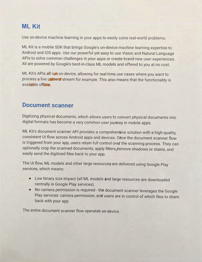 Số hoá tài liệu thực tế, cho phép người dùng chuyển đổi tài liệu thực tế sang định dạng kỹ thuật số đã trở thành một hành trình rất phổ biến của người dùng trong các ứng dụng di động. API trình quét tài liệu của Bộ công cụ học máy cung cấp một giải pháp toàn diện với quy trình giao diện người dùng nhất quán, chất lượng cao trên các ứng dụng và thiết bị Android. Sau khi quy trình quét tài liệu được kích hoạt từ ứng dụng của bạn, người dùng vẫn có toàn quyền kiểm soát quy trình quét. Người dùng có thể tuỳ ý cắt tài liệu đã quét, áp dụng bộ lọc, xoá bóng hoặc vết bẩn và dễ dàng gửi các tệp được số hoá trở lại ứng dụng của bạn.