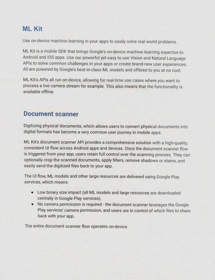 사용자가 실제 문서를 디지털 형식으로 변환할 수 있도록 하는 실제 문서의 디지털화는 모바일 앱에서 매우 일반적인 사용자 여정이 되었습니다. ML Kit의 문서 스캐너 API는 Android 앱과 기기 전반에서 고품질의 일관된 UI 흐름을 제공하는 포괄적인 솔루션을 제공합니다. 앱에서 문서 스캐너 흐름이 트리거되면 사용자는 스캔 프로세스를 완전히 제어할 수 있습니다. 선택적으로 스캔한 문서를 자르고, 필터를 적용하고, 그림자나 얼룩을 제거하고, 디지털화된 파일을 앱으로 쉽게 다시 보낼 수 있습니다.