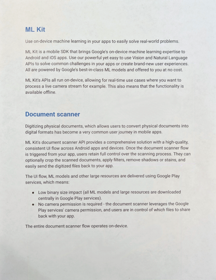 Số hoá tài liệu thực tế, cho phép người dùng chuyển đổi tài liệu thực tế sang định dạng kỹ thuật số đã trở thành một hành trình rất phổ biến của người dùng trong các ứng dụng di động. API trình quét tài liệu của Bộ công cụ học máy cung cấp một giải pháp toàn diện với quy trình giao diện người dùng nhất quán, chất lượng cao trên các ứng dụng và thiết bị Android. Sau khi quy trình quét tài liệu được kích hoạt từ ứng dụng của bạn, người dùng vẫn có toàn quyền kiểm soát quy trình quét. Người dùng có thể tuỳ ý cắt tài liệu đã quét, áp dụng bộ lọc, xoá bóng hoặc vết bẩn và dễ dàng gửi các tệp được số hoá trở lại ứng dụng của bạn.