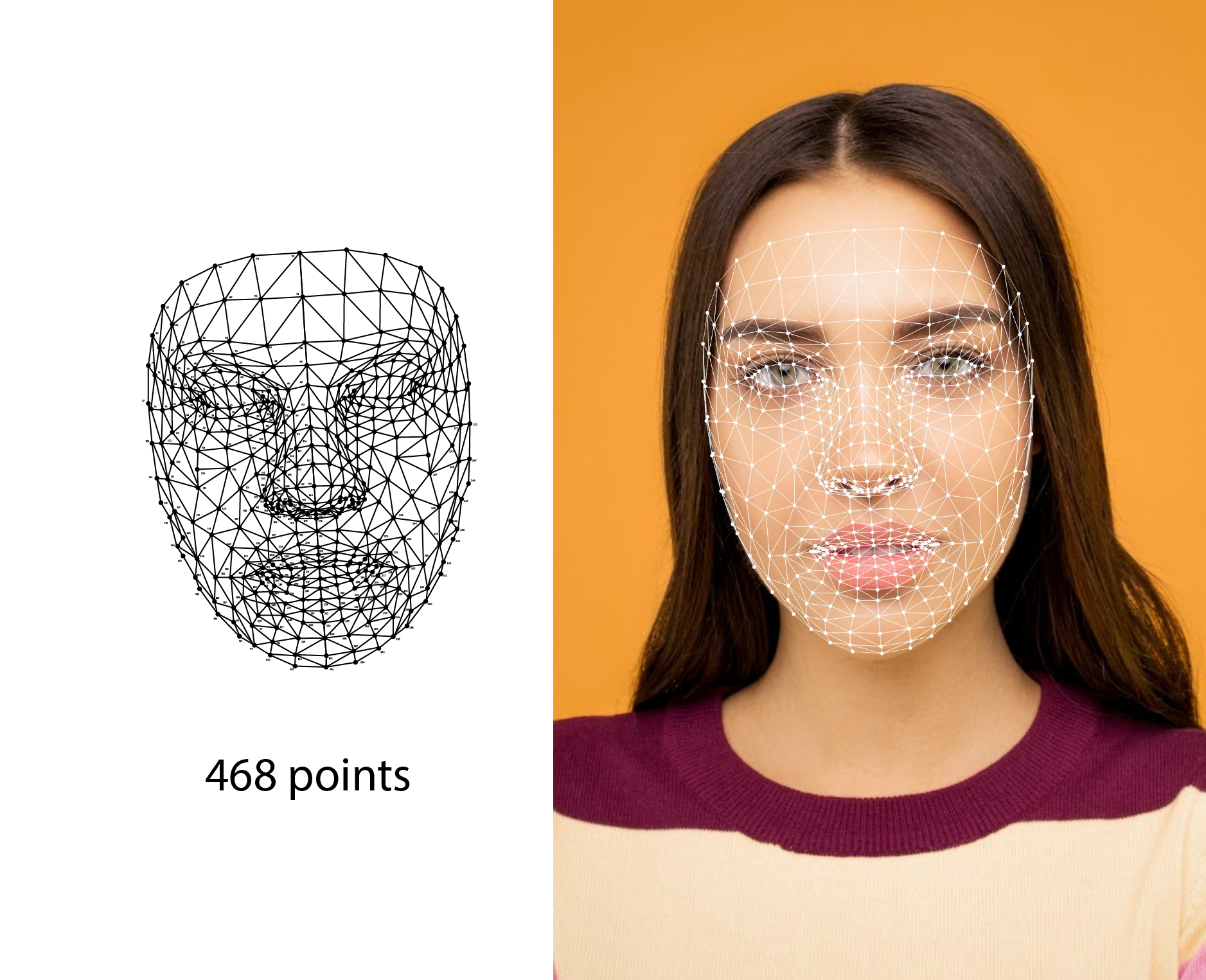 फ़ेस मेश डिटेक्शन एपीआई, पहचाने गए चेहरों के लिए फ़ेस मेश जनरेट करता है. हर फ़ेस में 468 3D पॉइंट और किनारे होते हैं. फ़ेस मेश की पहचान करने की सुविधा से, रीयल-टाइम में चेहरों पर सटीक कार्रवाइयां की जा सकती हैं. जैसे, एआर फ़िल्टर, सेल्फ़ी कैप्चर करना, और वीडियो चैट करना.