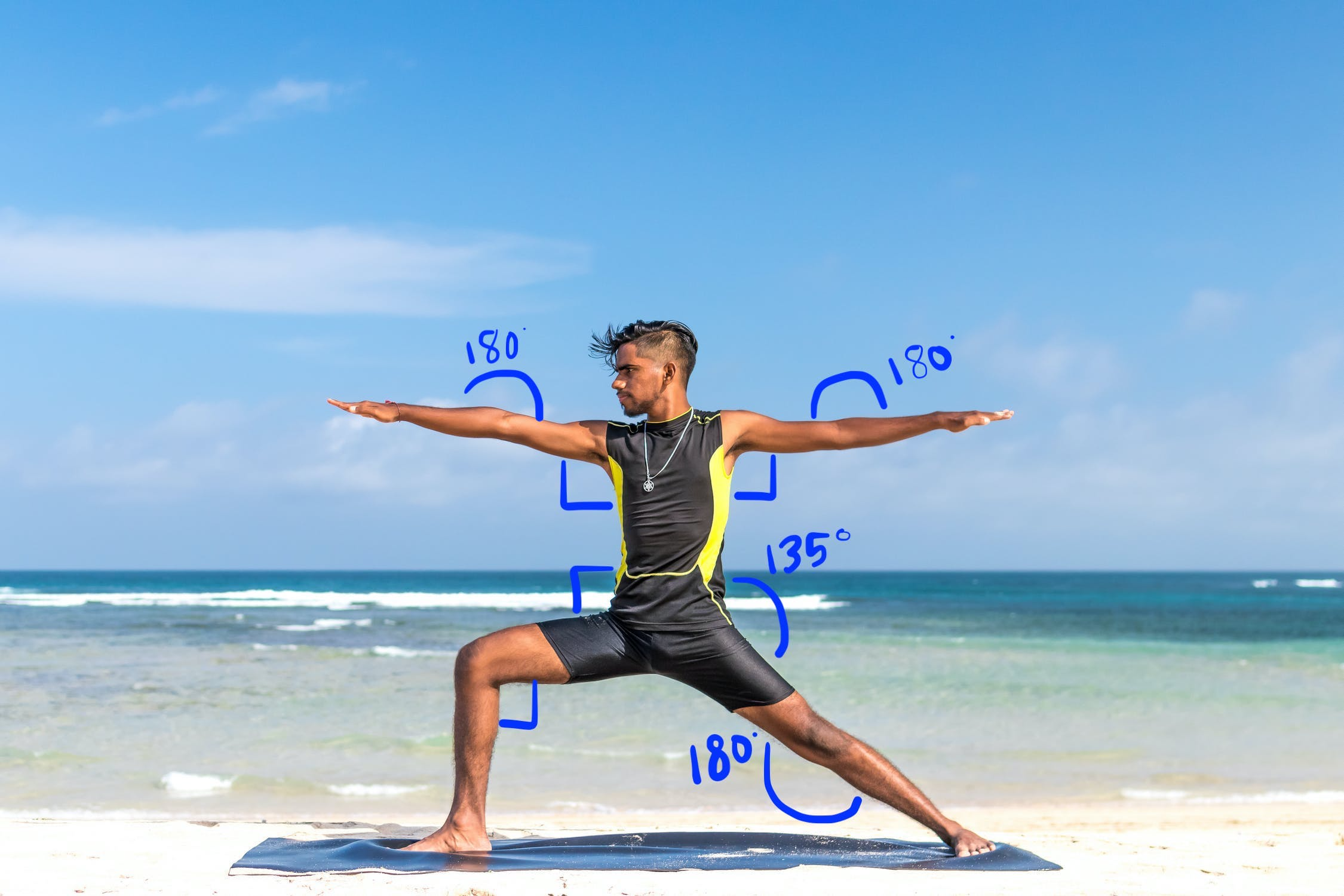 Bạn có thể xác định tư thế yoga bằng cách tính toán góc của nhiều khớp. Cho ví dụ: Hình 2 bên dưới minh hoạ tư thế yoga của Warrior II. Các góc gần đúng xác định tư thế này được viết bằng: