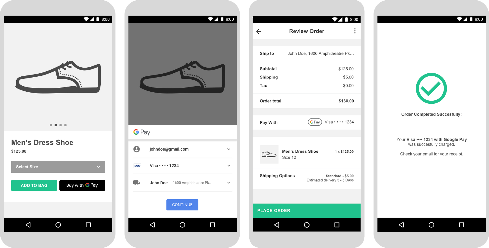 Estas pantallas representan un flujo de compra recomendado de Google Pay para una experiencia de carrito de compras.