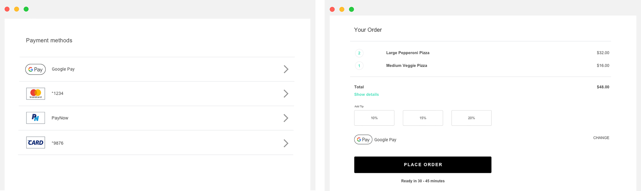 Khi người dùng có một thẻ đủ điều kiện trong tài khoản Google Pay, các nút thanh toán "Mua", "Thanh toán" và "Đơn giản" sẽ hiển thị mạng lưới thẻ và 4 chữ số cuối của số thẻ. Mạng thẻ sẽ xuất hiện ở cùng vị trí với văn bản "Mua bằng" hoặc "Thanh toán bằng".