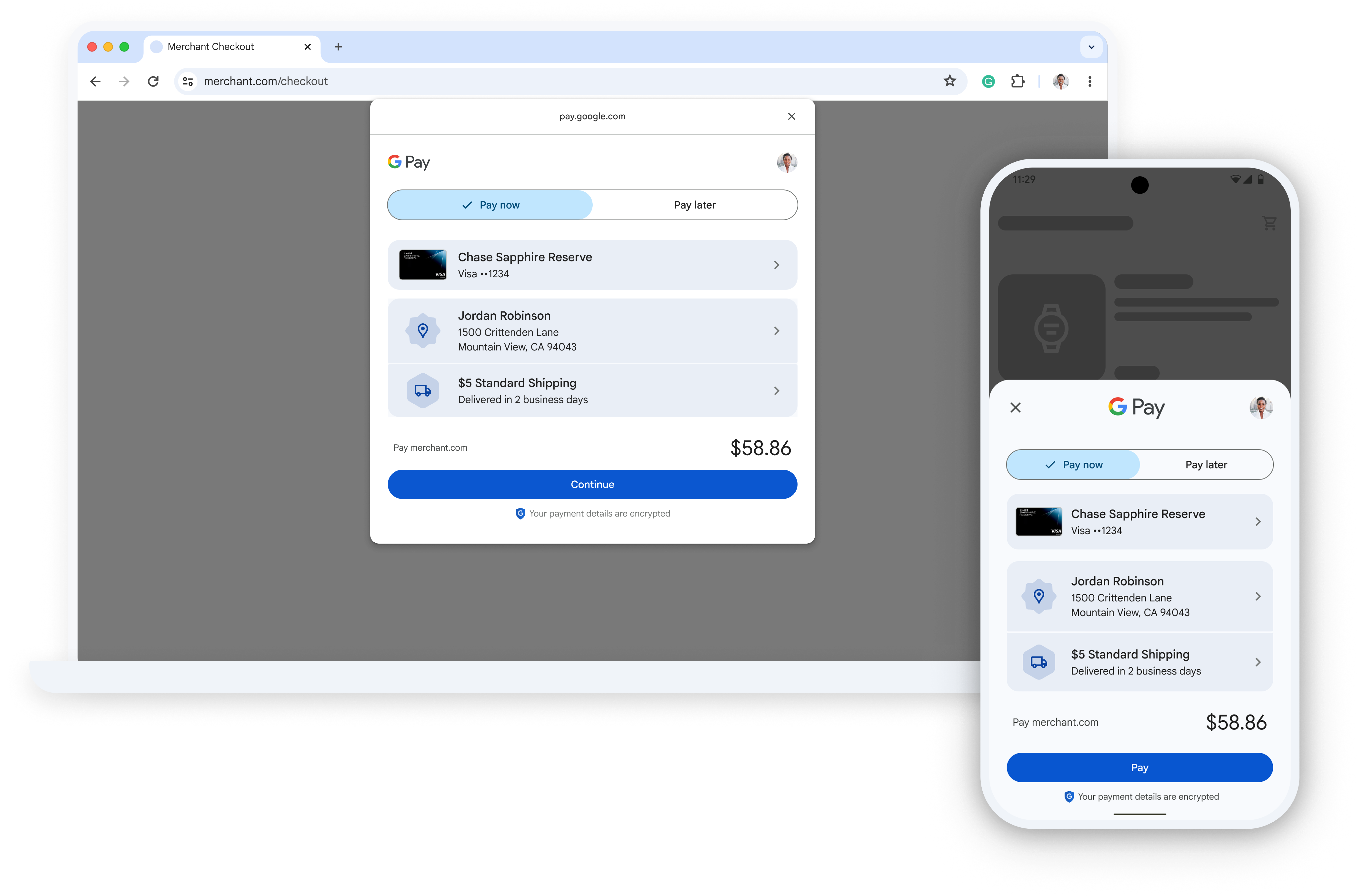 Google Pay 可与您现有的付款处理堆栈配合使用,只需几行代码即可实现。
