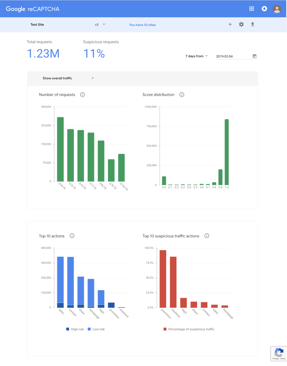 | সেরা 10টি অ্যাকশন | এই চার্টটি আপনার সাইটের জন্য সেরা 10টি অ্যাকশন (সামগ্রিক ট্রাফিক দ্বারা) দেখায়। আপনার সাইটের জন্য অভিযোজিত ঝুঁকি বিশ্লেষণ উন্নত করতে এবং আপনার ট্র্যাফিকের আরও বিশদ বিভাজন দেখতে, আপনি যে প্রতিটি জায়গায় reCAPTCHA যাচাইকরণ করেন সেখানে একটি কর্মের নাম উল্লেখ করুন। |