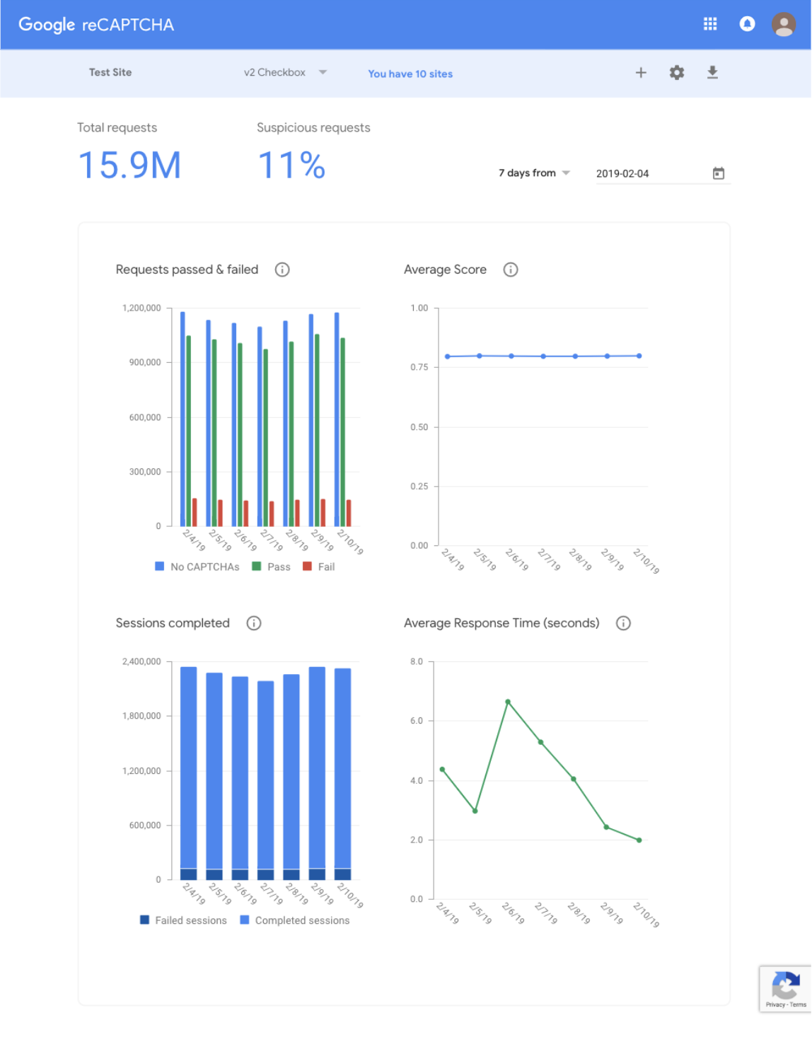 reCAPTCHA v2 網站類型會有 4 個圖表,在網站流量足夠前,部分圖表可能不會顯示。