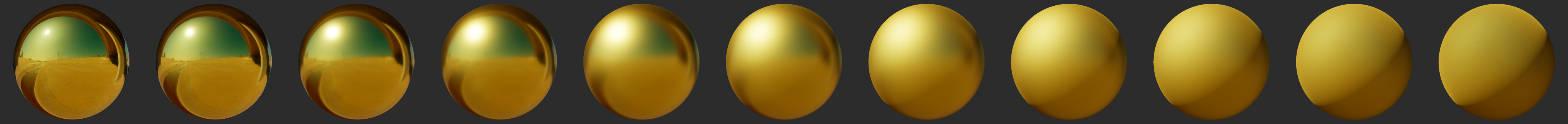 0.0 (왼쪽)에서 1.0 (오른쪽)까지의 가변 메탈에 다양한 anisotropy 효과가 미치는 영향은 다음과 같습니다 (이미지를 클릭하면 더 크게 볼 수 있음).