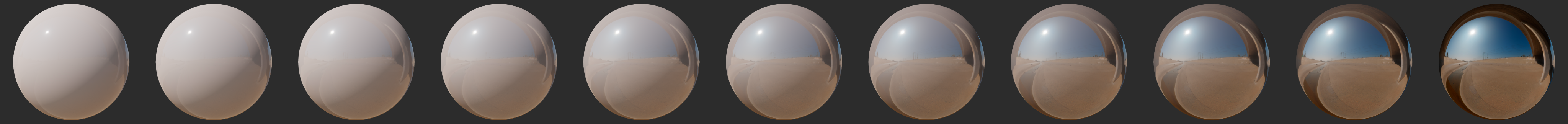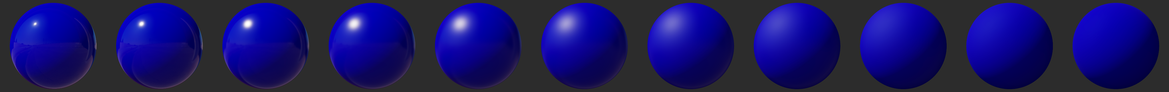 roughness 속성은 표면의 부드러운 동작을 제어합니다. roughness를 0으로 설정하면 표면이 완벽하게 매끄럽고 매우 광택됩니다. 표면이 비칠수록 '반사'가 커집니다. 이 속성은 다른 엔진 및 도구에서 종종 유광이라고 하며 거칠기 (roughness = 1 - glossiness)와 반대입니다.