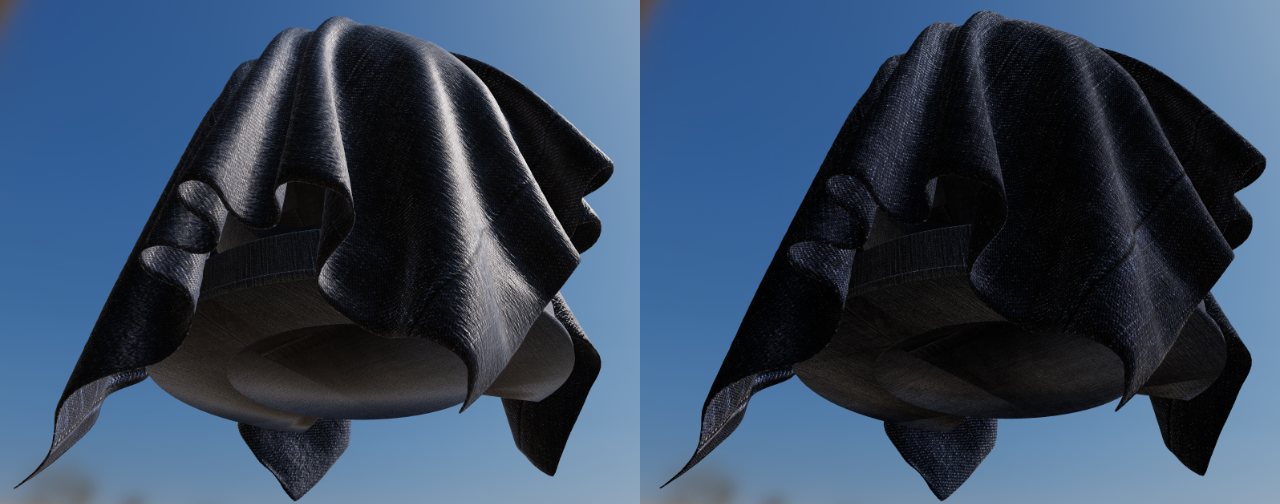 다음 이미지는 표준 모델(왼쪽)과 옷 모델 (오른쪽)을 사용하여 렌더링된 데님 패브릭을 비교합니다. 표준 머티리얼 모델이 데님 직물 샘플의 모양을 캡처하지 못하는 이유를 확인합니다 (왼쪽). 표면이 플라스틱과 유사하고 단단하게 표시되며 옷 조각보다 트랩과 더 유사합니다. 이는 흡수 및 산란으로 인한 더 부드러운 반사 로브가 직물의 충실한 재생성에 얼마나 중요한지를 보여줍니다.