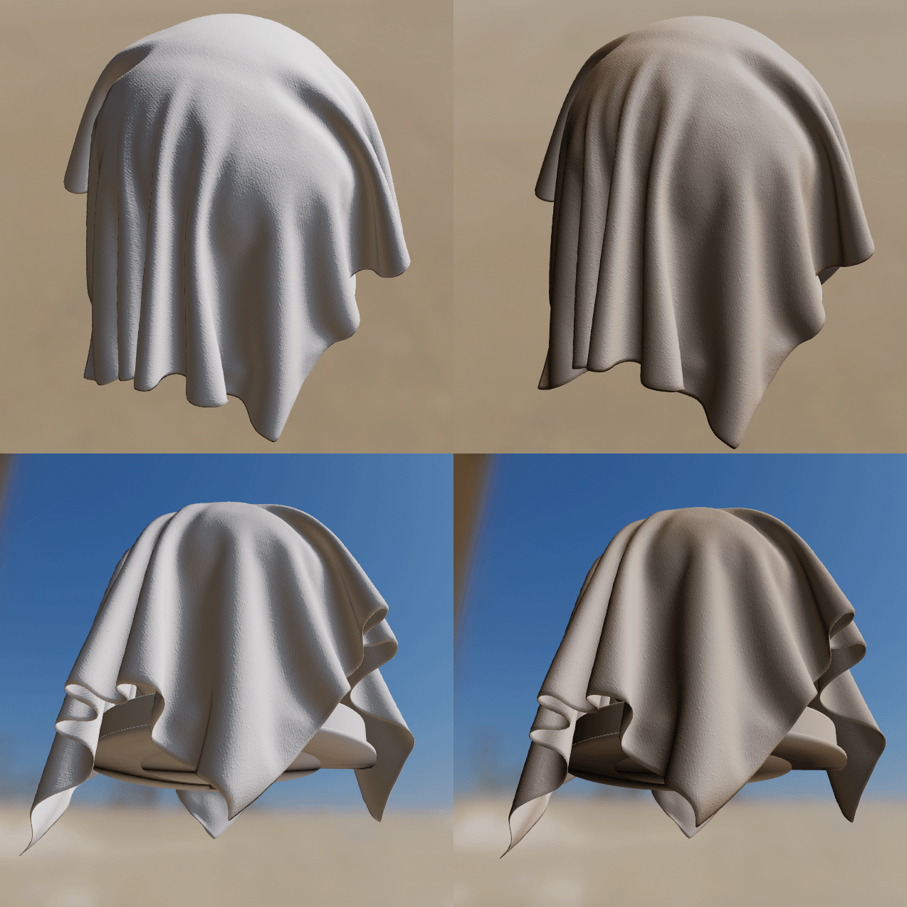 다음 이미지는 subsurfaceColor의 효과를 보여줍니다. 흰색 천 (왼쪽 열)과 흰색 갈색 표면 (오른쪽 열)이 있는 흰색 천입니다. 더 크게 보려면 이미지를 클릭하세요.