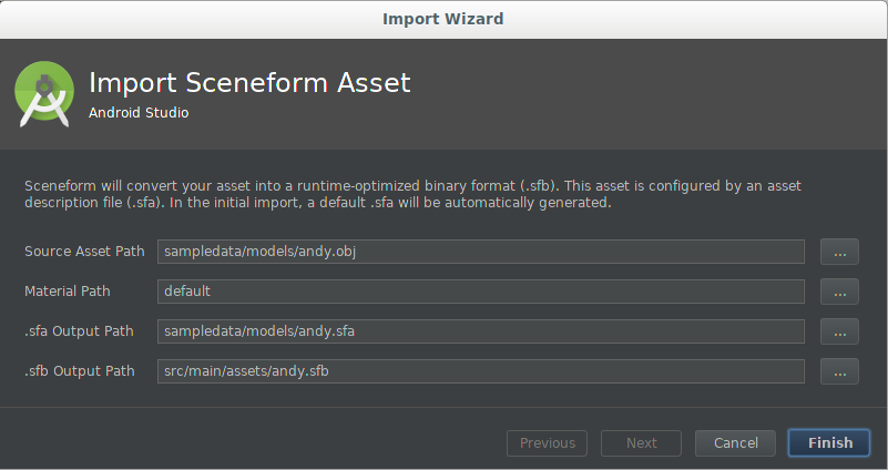 build.gradle의sceneform.asset()항목에서 사용하고 프로젝트에서*.sfa및*.sfb파일이 생성되는 위치를 결정합니다.모델을 처음으로 가져오는 경우 기본값을 사용합니다.