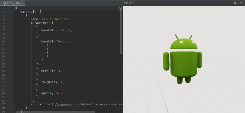 *.sfabelum disesuaikan, hapus file*.sfadan*.sfbyang ada dan entrisceneform.asset()dibuild.gradleaplikasi, lalu impor ulang aset. Hal ini memastikan bahwa atribut*.sfadan parameter material yang dibuat ulang akan cocok dengan atribut yang didukung oleh bahan kustom Anda.Untuk mempertahankan penyesuaian
