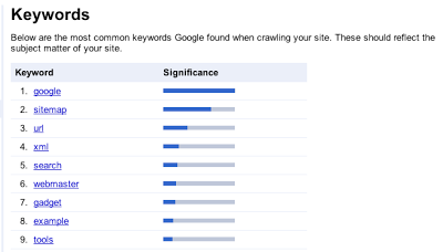 [[["Easy to understand","easyToUnderstand","thumb-up"],["Solved my problem","solvedMyProblem","thumb-up"],["Other","otherUp","thumb-up"]],[["Missing the information I need","missingTheInformationINeed","thumb-down"],["Too complicated / too many steps","tooComplicatedTooManySteps","thumb-down"],["Out of date","outOfDate","thumb-down"],["Samples / code issue","samplesCodeIssue","thumb-down"],["Other","otherDown","thumb-down"]],[],[],["The core announcement details a new user interface for the Keywords feature, which now updates daily. It provides keyword frequency, a significance comparison to the site's most popular keyword, and up to ten URLs containing each keyword. This feature helps identify hacked content by revealing unrelated keywords (e.g., \"Viagra,\" \"casino\") and their corresponding URLs, aiding in the swift removal of unwanted material. This tool is also useful when re-implementing sites on new frameworks.\n"]]