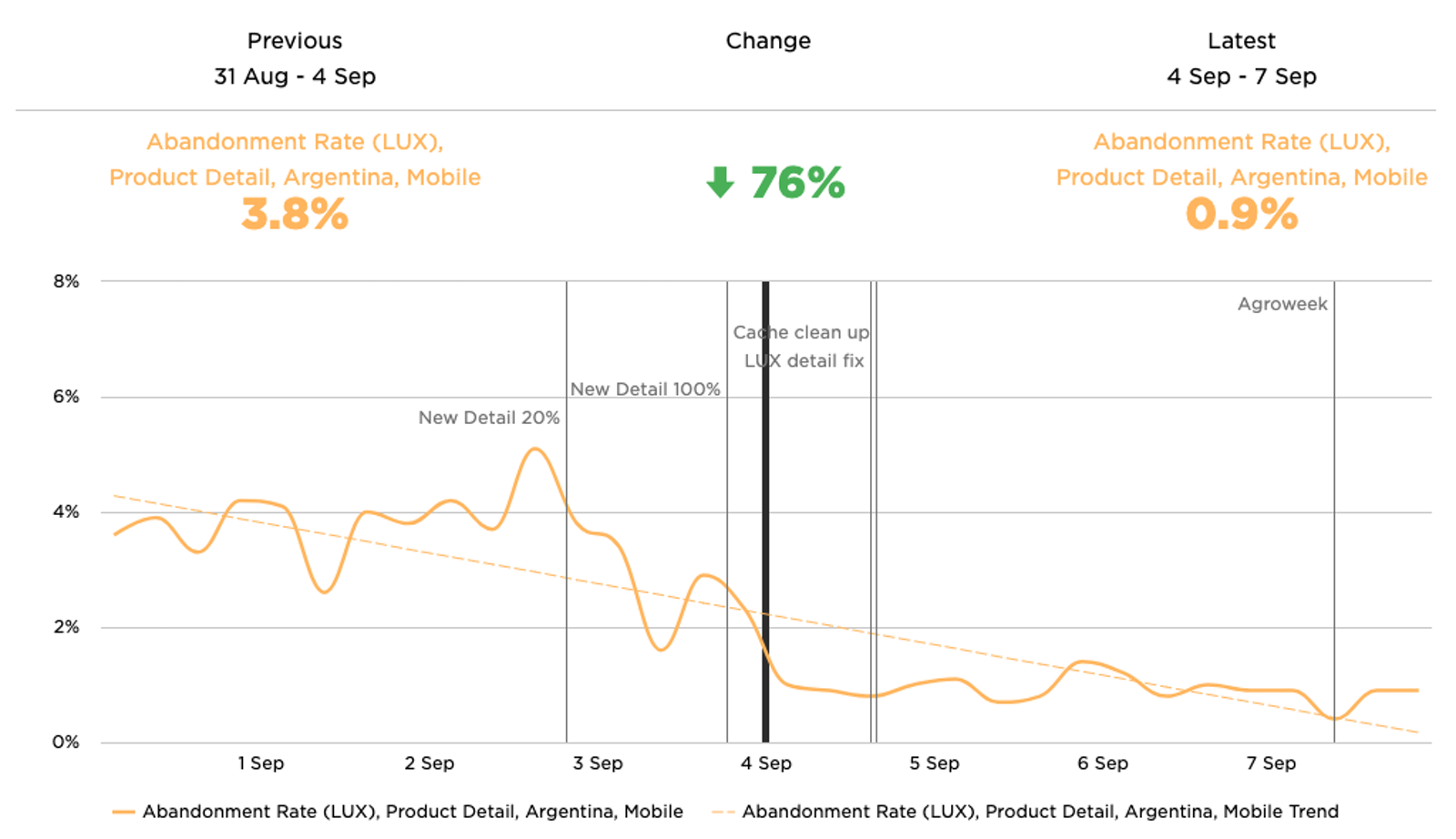 동일한 기간 동안 실제 사용자 모니터링 데이터 (필드 데이터라고도 함)에서 제품 세부 정보 페이지의 로드 포기율이 3.8% 에서 0.9% 로 76% 감소한 것으로 나타났습니다.