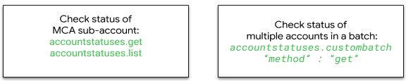 Puedes usar accountstatuses.get para ver la información del estado de una sola cuenta de comerciante.
