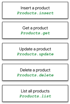 La ressource products permet d'insérer, d'obtenir, de mettre à jour et de supprimer un produit à la fois (à l'aide des méthodes insert, get, update et delete), ainsi que de lister tous les produits dans la base de données Merchant Center (méthode list).