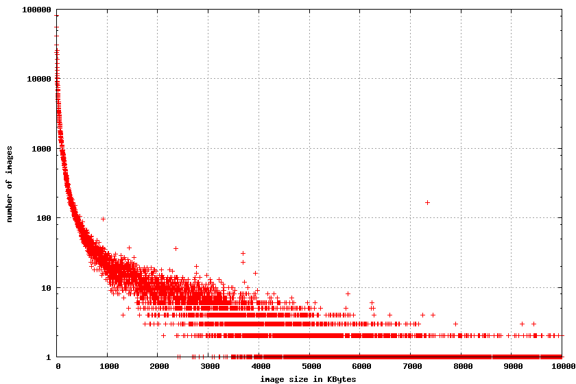 Wykres pokazuje, że większość obrazów była mała. Częstotliwość wyświetlania obrazów o rozmiarze większym niż 500 tys. jest zwykle mniejsza niż 100.