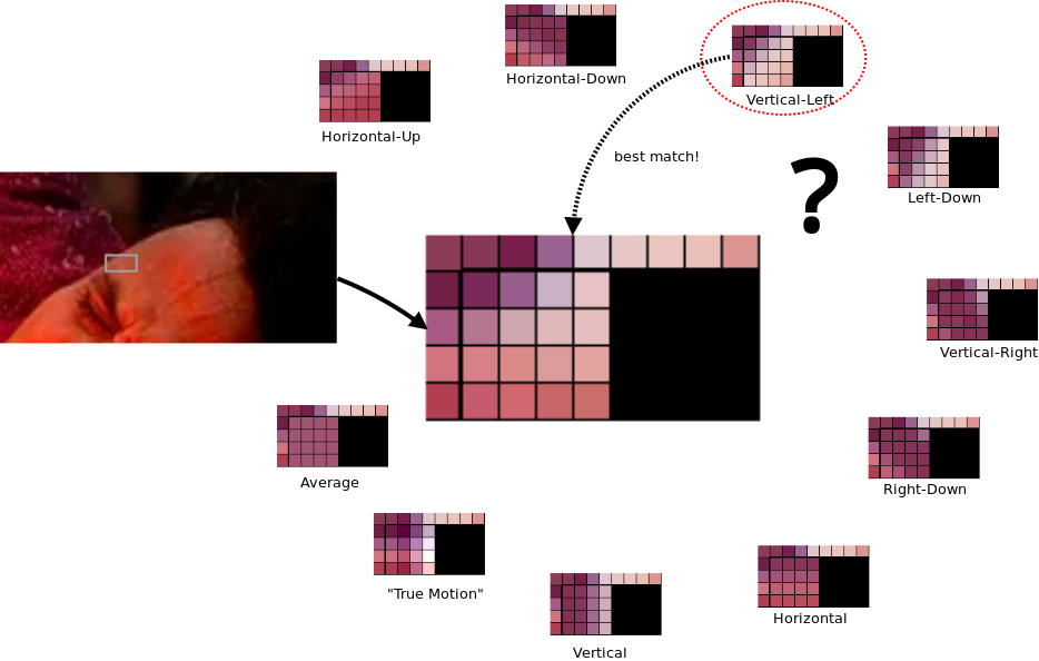 W każdym makrobloku koder może przewidywać zbędne informacje o ruchu i kolorze na podstawie wcześniej przetworzonych bloków. Ramka obrazu jest „kluczowa” w tym sensie, że wykorzystuje tylko piksele, które zostały już zdekodowane w bezpośredniej przestrzeni sąsiedztwa każdego makrobloku, i próbuje wypełnić nieznaną część. Nazywamy to kodowaniem predykcyjnym (patrz kodowanie wewnątrzramkowe filmu VP8).