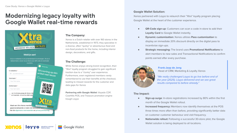 পিৎজা এক্সপ্রেস হংকং ফিজিক্যাল লয়্যালটি কার্ডের পরিবর্তে গুগল ওয়ালেটে সংরক্ষণযোগ্য লয়্যালটি পাস চালু করেছে। গুগল ওয়ালেটে নতুন ডিজিটাল ক্লাবকার্ড সদস্যপদ ৫.৫ গুণ বৃদ্ধিতে সহায়তা করেছে। এই নতুন ডিজিটাল সদস্যরা প্রতি লেনদেনে গড়ে ২৫% বেশি ব্যয় করে।