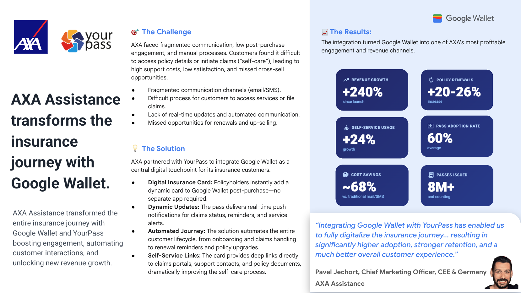 Чтобы решить проблему высоких затрат и низкой вовлеченности, AXA использовала Google Wallet в качестве центральной точки взаимодействия. Это привело к росту выручки на 240%, увеличению количества продлений на 20–26% и экономии средств на 68%.