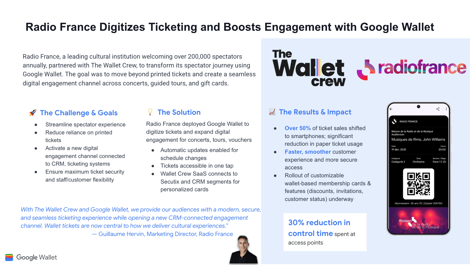 Стремясь выйти за рамки печатных билетов и привлечь зрителей, Радио Франс оцифровало билеты. Это позволило перевести более 50% продаж на смартфоны и сократить время контроля доступа на 30%.