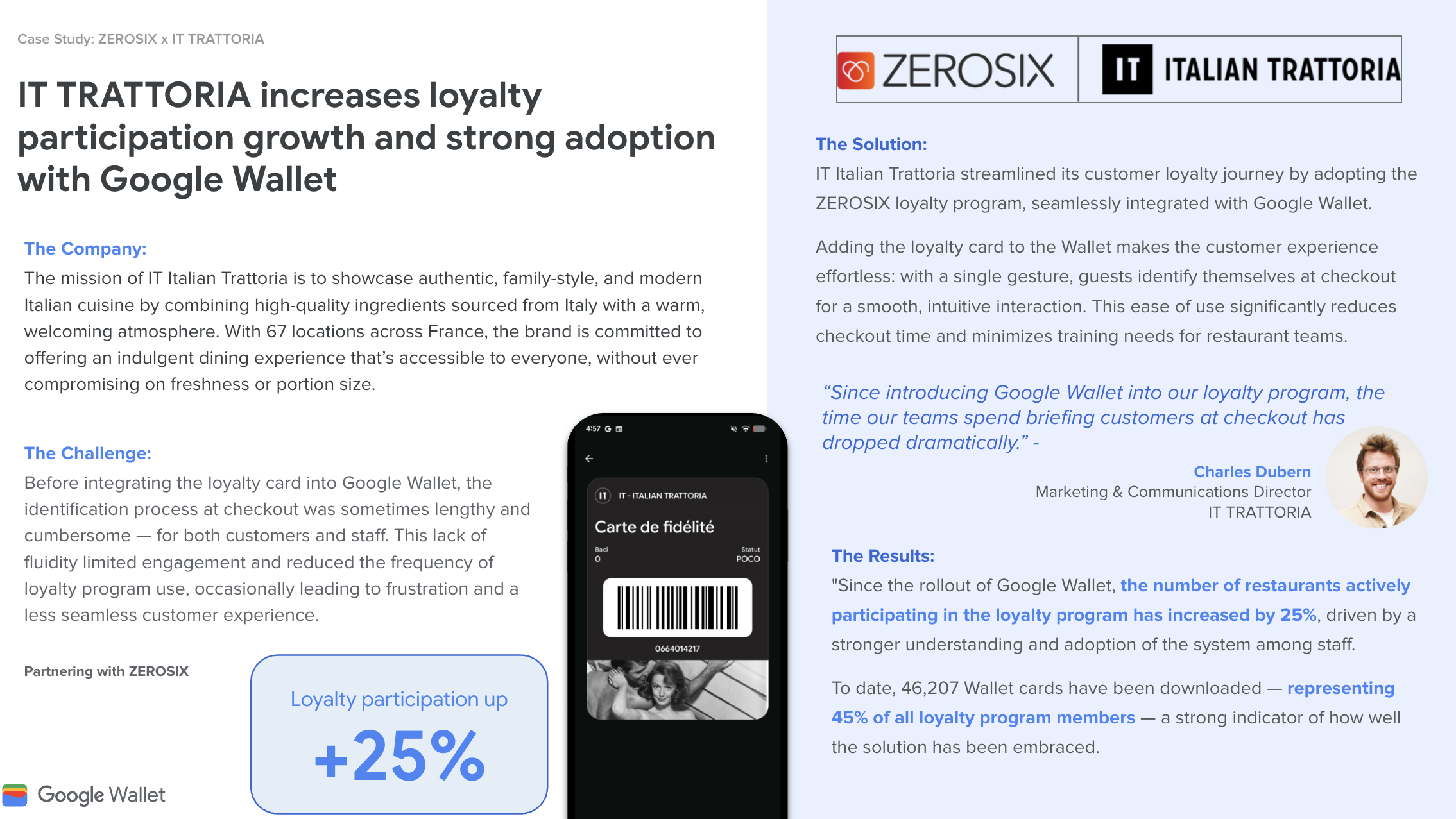 IT Trattoria решила свою сложную процедуру лояльности, интегрировав программу ZEROSIX с Google Wallet. Это упростило процесс оформления заказа, сократило время ожидания и увеличило количество активных участников программы лояльности на 25%. 45% всех клиентов (46 207) оформили цифровой пропуск.