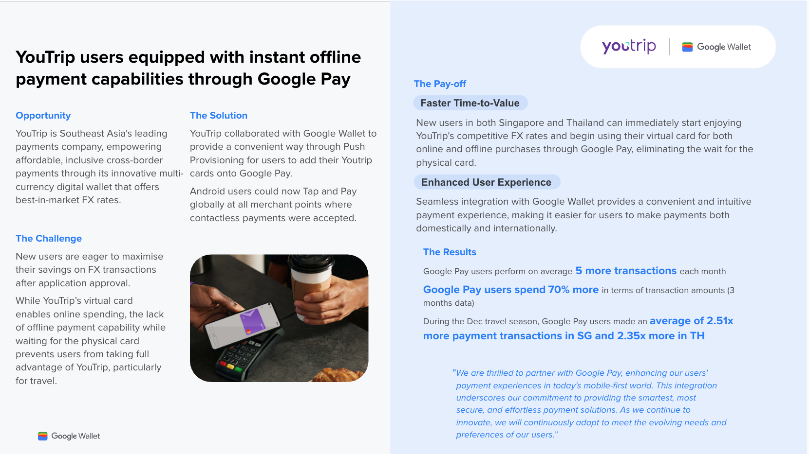 YouTrip устранил проблему, из-за которой новые пользователи не могли платить, ожидая получения физической карты. Теперь пользователи Google Pay тратят на 70% больше и совершают в среднем на 5 транзакций больше в месяц.