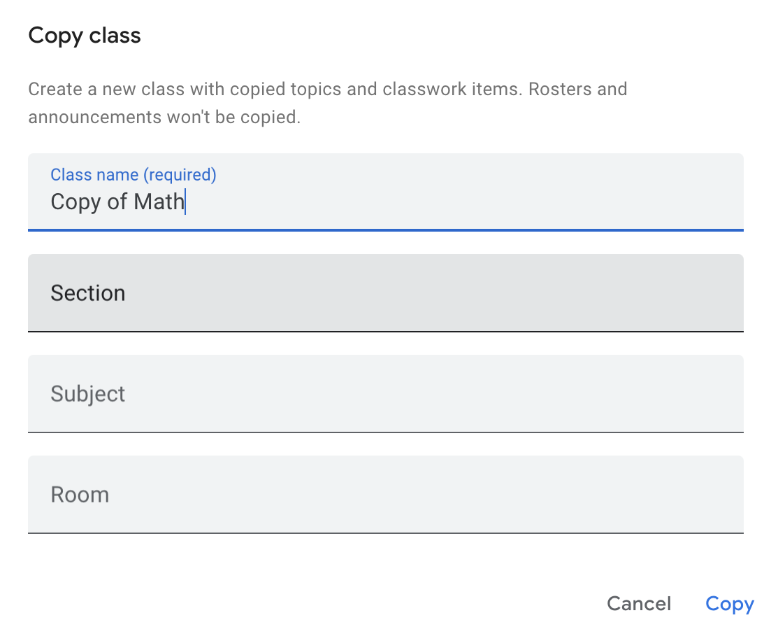 図 1. 教師は、Classroom の縦の点線メニューに移動して [コピー] をクリックすることで、コースをコピーできます。教師は、ポップアップでコースの詳細を指定してコピーできます。