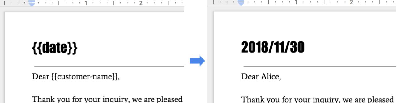 String customerName = "Alice"; DateTimeFormatter formatter = DateTimeFormatter.ofPattern("yyyy/MM/dd"); String date = formatter.format(LocalDate.now()); Listrequests = new ArrayList<>(); // One option for replacing all text is to specify all tab IDs. requests.add(new Request() .setReplaceAllText(new ReplaceAllTextRequest() .setContainsText(new SubstringMatchCriteria() .setText("{{customer-name}}") .setMatchCase(true)) .setReplaceText(customerName) .setTabsCriteria(new TabsCriteria() .addTabIds(TAB_ID_1) .addTabIds(TAB_ID_2) .addTabIds(TAB_ID_3)))); // Another option is to omit TabsCriteria if you are replacing across all tabs. requests.add(new Request() .setReplaceAllText(new ReplaceAllTextRequest() .setContainsText(new SubstringMatchCriteria() .setText("{{date}}") .setMatchCase(true)) .setReplaceText(date))); BatchUpdateDocumentRequest body = new BatchUpdateDocumentRequest(); service.documents().batchUpdate(DOCUMENT_ID, body.setRequests(requests)).execute();