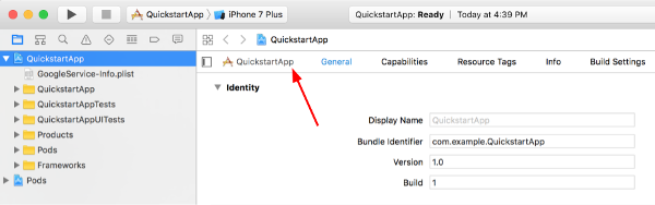 8. Khi vẫn chọn nút dự án, hãy chọn "QuickstartApp" trong phần TARGETS (MỤC TIÊU) như minh hoạ trong 2 hình bên dưới: